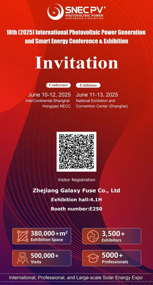 Meil on hea meel sellest teatadaZhejiang Galaxy Fuse Co., Ltd. eksponeerib eelseisval18. (2025) Rahvusvaheline fotogalvaaniline elektritootmine ja nutikas energia konverents ja näitus (SNEC PV+ 2025)Shanghais. Fotogalvaaniliste ja uute energiasektori iga -aastase sündmusena koondab SNEC PV+ juhtivat globaalseid ettevõtteid ja spetsialiste, et arutada tööstuse suundumusi ning tutvustada uusimaid tehnoloogiaid ja tooteid.